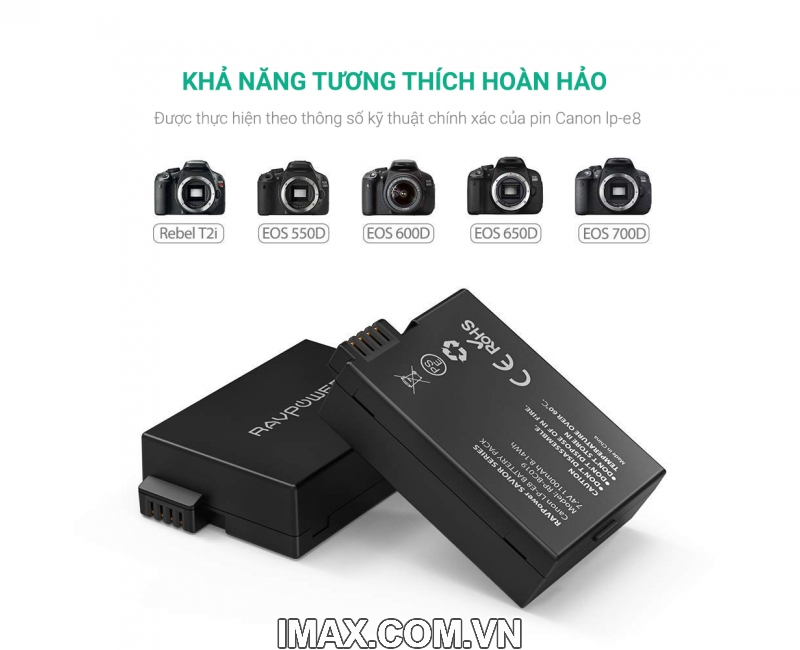 Pin máy ảnh Ravpower được thiết kế hoàn toàn giống với pin Canon LP - E8 về hình dáng cũng như các thông số kỹ thuật. Do đó,pin Ravpower có khả năng tương thích 100% với các mẫu máy ảnh Canon EOS Rebel T2i, T3i, T4i, T5i, EOS 550D, EOS 600D, EOS 650D, EOS 700D,...