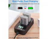 - Tích hợp 2 pin và 1 bộ sạc USB kép với 1 dây Micro USB cho Canon LP-E5