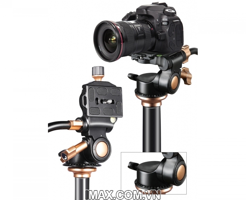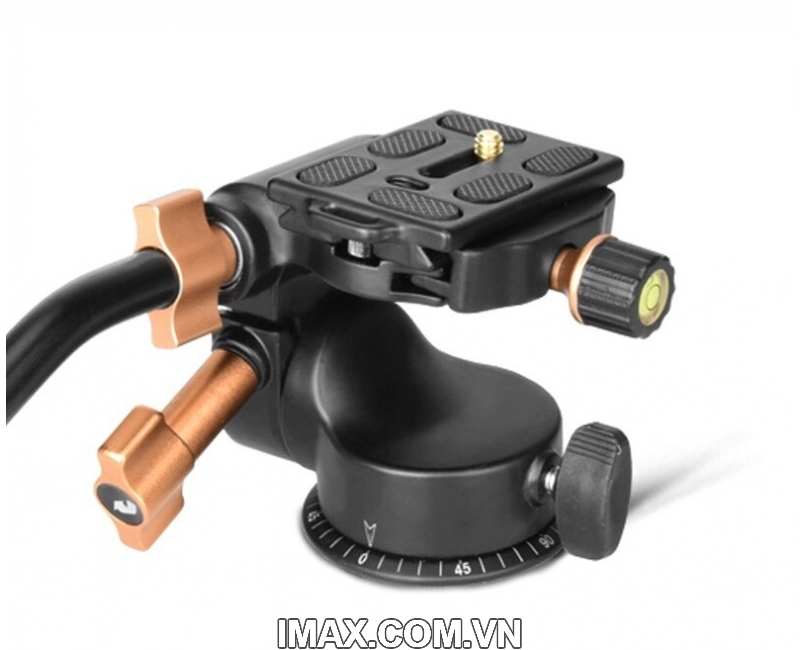 - Cơ chế đầu ball head là có 1 khóa xoay 360 độ, tilt up/down, lên xuống.