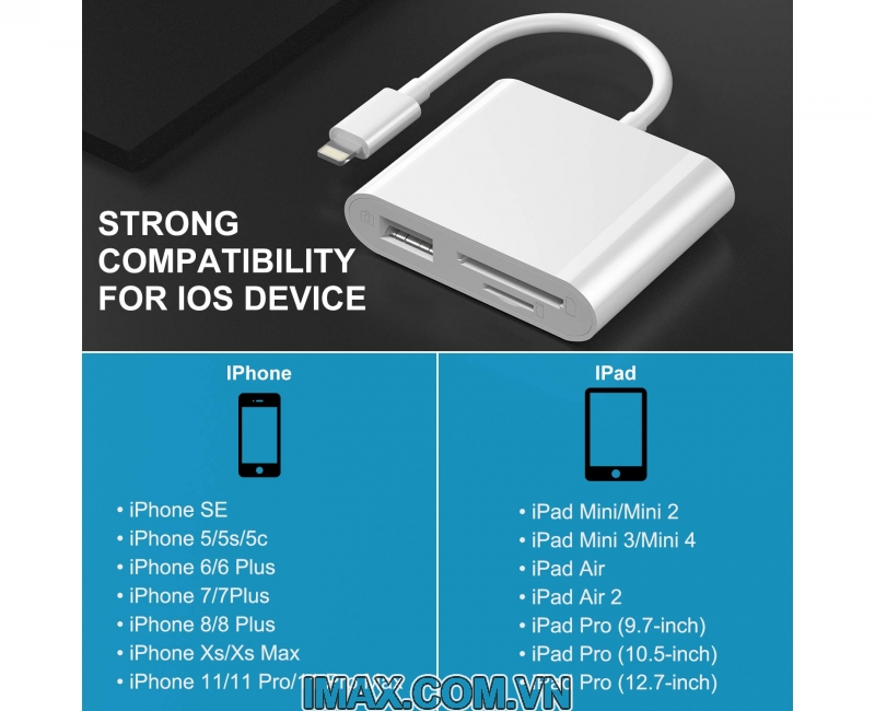 Sử dụng đầu đọc thẻ này để kết nối iPhone / iPad và trình điều khiển flash USB, sau 3-5 giây, iPhone của bạn sẽ tự động bật lên Ứng dụng '' Ảnh ''. Bạn có thể chuyển ảnh / video sang iPhone và iPad trực tiếp. (LƯU Ý: Nếu ảnh / video không phải do máy ảnh chụp, vui lòng tạo một thư mục có tên "DCIM" vào thư mục gốc của ổ flash USB, sau đó tạo một thư mục có tên "100CANON" vào "DCIM". Sao chép ảnh / videos vào thư mục "100CANON". Đổi tên từng tệp ảnh và video thành "IMG_XXXX", trong đó XXXX là một số duy nhất.)
