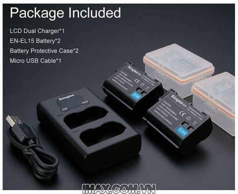 - Bao gồm 1 pin, 2 hộp đựng pin, 1 bộ sạc USB kép và 1 cáp micro USB cho Nikon EN-EL15